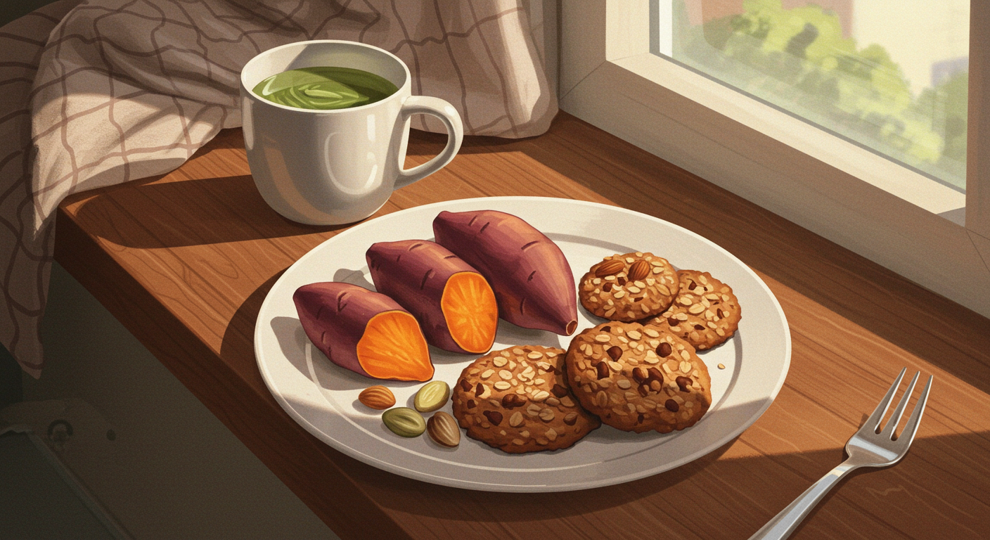 - 현미밥, 고구마 등 복합 탄수화물 위주로 섭취